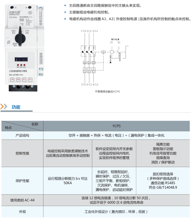 江蘇遠泰電器生產的YCPS系列控制與保護開關電器,以模塊化單一結構形式,將斷路器接觸器、過載繼電器、隔離開關、漏電、電流電壓表等分離元器件的主要功能集成化,并能夠綜合各種信號,實現控制與保護特性在產品內部自配合。具有體積小、短路分斷性能指標高,機電壽命長和運行可靠性高,使用安全方便、節能節材等優點。