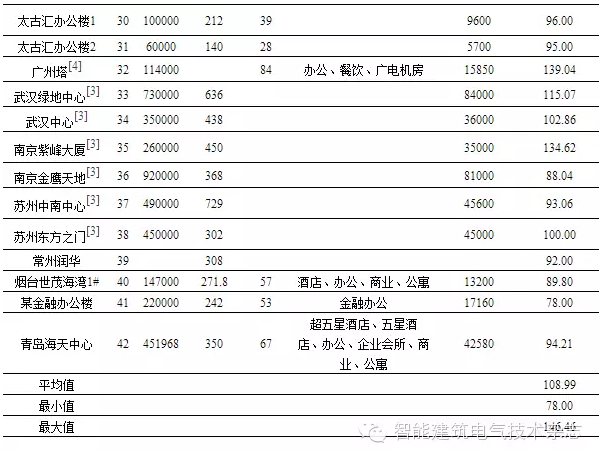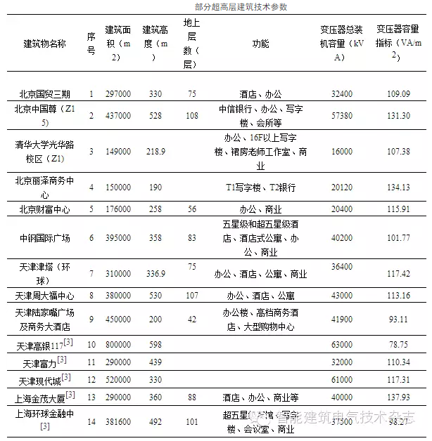 超高層建筑在我國發展越來越快,數量多、高度高、建筑面積大、功能多樣,設計要求越來越高,建筑電氣設計往往采用較高的標準。現在行業內不少專家認為民用建筑的計算負荷偏大,變壓器安裝容量偏大,變壓器實際負荷率偏低,設計偏保守,不僅浪費資源,增加投資,也明顯違背節能、節材的理念。筆者調研大量實際工程,分析比較典型超高層建筑的電氣數據,最終得出超高層建筑變壓器容量指標,為以后的超高層建筑電氣設計提供參考。
