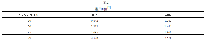 引入頻數分布概約估計法, 一個服從正態分布的變量只要知道其均值與標準差就可根據公式(3)估計任意取值范圍內的頻數比例,即可制定參考值范圍,其中常用u值表見表2。