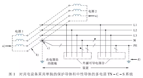 圖1是GB / T 16895. 1 - 2008對用電設備采用單獨的保護導體和中性導體的多電源TN - C - S系統圖示(原圖31D)。