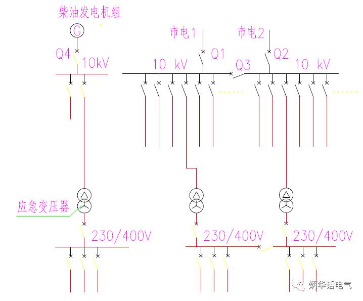 正常時,兩個市電同時工作,Q3斷開。Q5閉合,由市電1帶應急變壓器。應急情況下,市電1和2均斷電,柴油發電機組啟動并投入運行,Q4閉合,Q5斷開與市電脫鉤,由發電機組向應急變壓器供電。