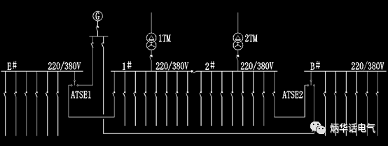 (B#為備用母線,E#為應急母線,1#、2#為普通負荷母線。E#、B#共用柴油發電機組G分別作為應急電源和備用電源)